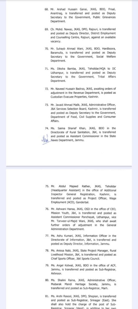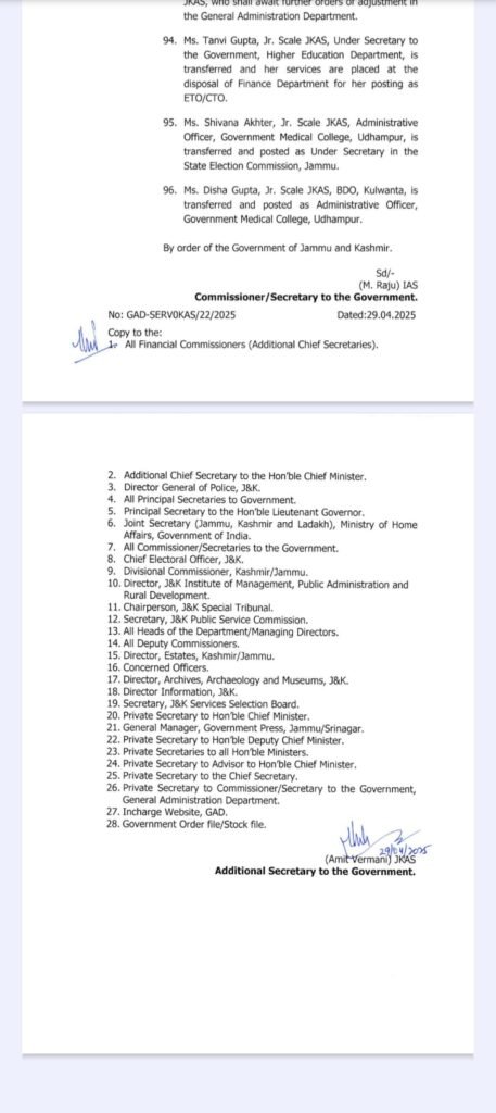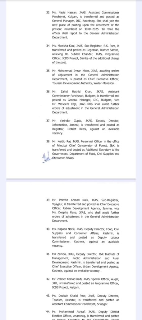 LATEST NEWS Ex-Servicemen Rally in Kishtwar to Mark 10th Armed Forces Veterans Day Chief Secretary Ashish Kundra Visits Dha–Biama Village Lieutenant Governor pays tribute to ex-servicemen, Veer Naris and their family members at Rajouri G.H. Sheikh takes over as Chairman J&K BOSE VETERAN’S OF DEFENCE FORCES PROMISE TO BE THE PILLARS OF PROGRESS IN NATION BUILDING AT KUPWARA JammuKashmir Less than 1 min.Read 96 JKAS officers transferred, posted By Diplomat Digital April 29, 2025 FacebookTwitterPinterestWhatsApp Hot this week Chenab Valley Ex-Servicemen Rally in Kishtwar to Mark 10th Armed Forces Veterans Day January 14, 2026 0 Imran Shah Kishtwar: 5 Sector Assam Rifles under the aegis... Ladakh Chief Secretary Ashish Kundra Visits Dha–Biama Village January 14, 2026 0 Diplomat Correspondent Leh: The Chief Secretary of the Union Territory... Pir Panjal Lieutenant Governor pays tribute to ex-servicemen, Veer Naris and their family members at Rajouri January 14, 2026 0 Our veterans and brave army soldiers always put the... Jammu G.H. Sheikh takes over as Chairman J&K BOSE January 14, 2026 0 Diplomat Correspondent JAMMU: Ghulam Hassan Sheikh today took over... Kashmir VETERAN’S OF DEFENCE FORCES PROMISE TO BE THE PILLARS OF PROGRESS IN NATION BUILDING AT KUPWARA January 14, 2026 0 Diplomat CorrespondentKupwara: Indian Defence Forces Veterans’ Day is celebrated... Topics Chenab Valley Ex-Servicemen Rally in Kishtwar to Mark 10th Armed Forces Veterans Day 0 Imran Shah Kishtwar: 5 Sector Assam Rifles under the aegis... Ladakh Chief Secretary Ashish Kundra Visits Dha–Biama Village 0 Diplomat Correspondent Leh: The Chief Secretary of the Union Territory... Pir Panjal Lieutenant Governor pays tribute to ex-servicemen, Veer Naris and their family members at Rajouri 0 Our veterans and brave army soldiers always put the... Jammu G.H. Sheikh takes over as Chairman J&K BOSE 0 Diplomat Correspondent JAMMU: Ghulam Hassan Sheikh today took over... Kashmir VETERAN’S OF DEFENCE FORCES PROMISE TO BE THE PILLARS OF PROGRESS IN NATION BUILDING AT KUPWARA 0 Diplomat CorrespondentKupwara: Indian Defence Forces Veterans’ Day is celebrated... Ladakh Workshop on Ladakh Sustainable Industrial Policy 2022-27 in Leh 0 Diplomat CorrespondentLeh: District Industries Centre Leh organized an Awareness... Jammu “AIIMS Is a Badge of Honour”: Prof. Daya Nand Sharma addressed Faculty to Lead with Excellence, Integrity and Compassion 0 Diplomat Correspondent Jammu, Prof.Daya Nand Sharma, ED & CEO,... Ladakh Ice Hockey: Trials for Khelo India Winter Games Begin in Leh 0 Diplomat CorrespondentLeh: The UT Ladakh team selection trials for... Related Articles G.H. Sheikh takes over as Chairman J&K BOSE Jammu January 14, 2026 VETERAN’S OF DEFENCE FORCES PROMISE TO BE THE PILLARS OF PROGRESS IN NATION BUILDING AT KUPWARA Kashmir January 14, 2026 “AIIMS Is a Badge of Honour”: Prof. Daya Nand Sharma addressed Faculty to Lead with Excellence, Integrity and Compassion Jammu January 14, 2026 BADC Seeks Time Bound Panchayat Polls in J&K Jammu January 14, 2026 RTI Activist Urges Extension of Winter Vacations in Jammu Schools Jammu January 14, 2026 Previous articleIndian Army Organises Cyber Security Awareness Camp for Local Youth at Kulhand, DodaNext articleMission Director JJM, J&K directs officers to speed up pace of execution of Water Supply projects in district Kupwara