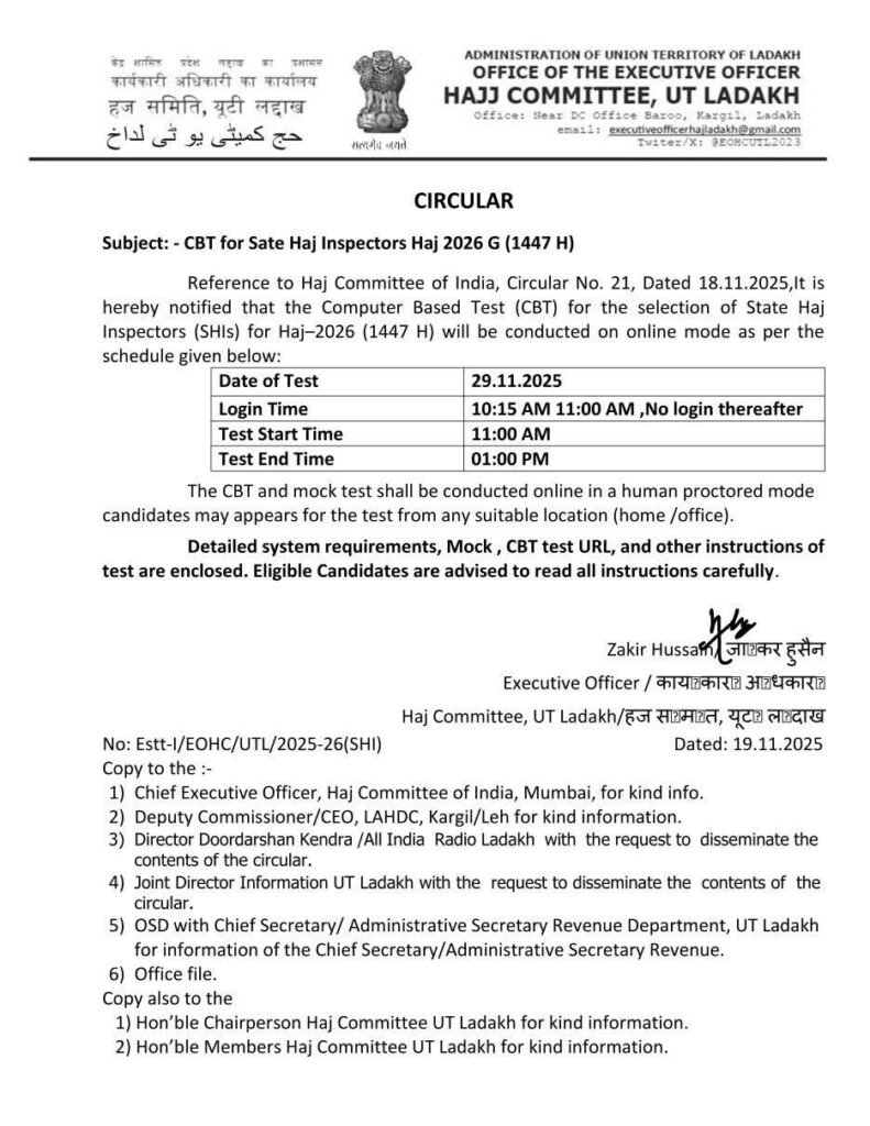 As per Haj Committee of India Circular No. 21 (18.11.2025), the online Computer-Based Test for selecting State Haj Inspectors will be held on 29 Nov 2025.