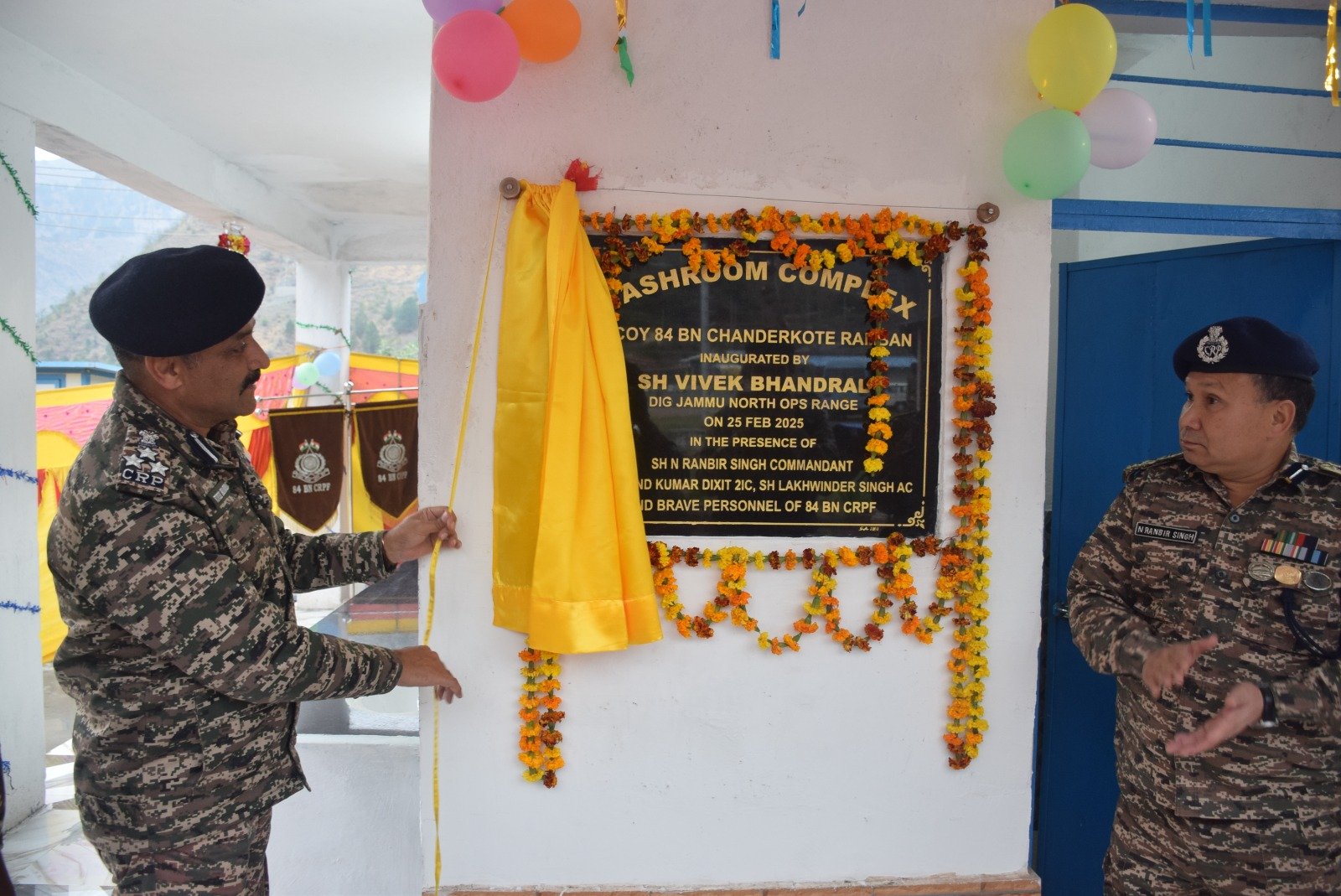 RAMBAN, Feb 25,DD: Vivek Bhandral DIG CRPF Jammu North Ops Range Inaugurated Washroom Complex at G Coy 84 Bn CRPF at Chanderkote Ramban.In the presence of N Ranbir Singh Commandant 84 Bn, Arvind Kumar Dixit Second in Command, Unit personnel of 84 Bn being midway between Jammu and Srinagar, many times, especially during Amarnath Yatra and Elections.CRPF and other SF are compelled to make halt at Chanderkote due to landslide, snow fall, etc. During to the open ground parking facility available at the G Coy CRPF location is also a main halting point. Earlier, only a handful of toilets were available and whenever additional transients are diverted, the Coy and transients faced extreme hardship due to scarcity of toilets.While speaking during the function, Vivek Bhandral DIG stated that it is the responsibility of the senior commanders to ensure the basic needs of the troops so that they can perform their assigned duties without any hassles.The Washroom Complex, comprising 10 toilets and 04 bathrooms have been constructed under CSR scheme sponsored by M/s Petronet LNG Limited.With the opening of this Complex, the Unit personnel and transients will have a comfortable stay at this camp, especially during SANJY, Elections, Rainy Season, Snow Fall. DD