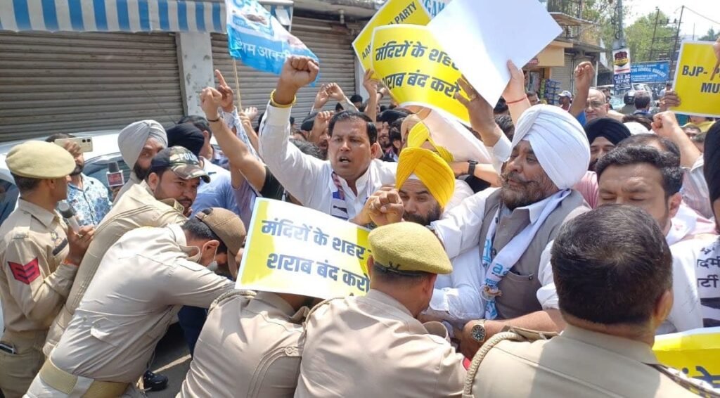 During this time, the protesters were raising slogans like stop liquor in the city of temples, stop politics in the name of religion, Mehraj Malik Zindabad. During the protest, the anger against the BJP was clearly visible among the protesters.