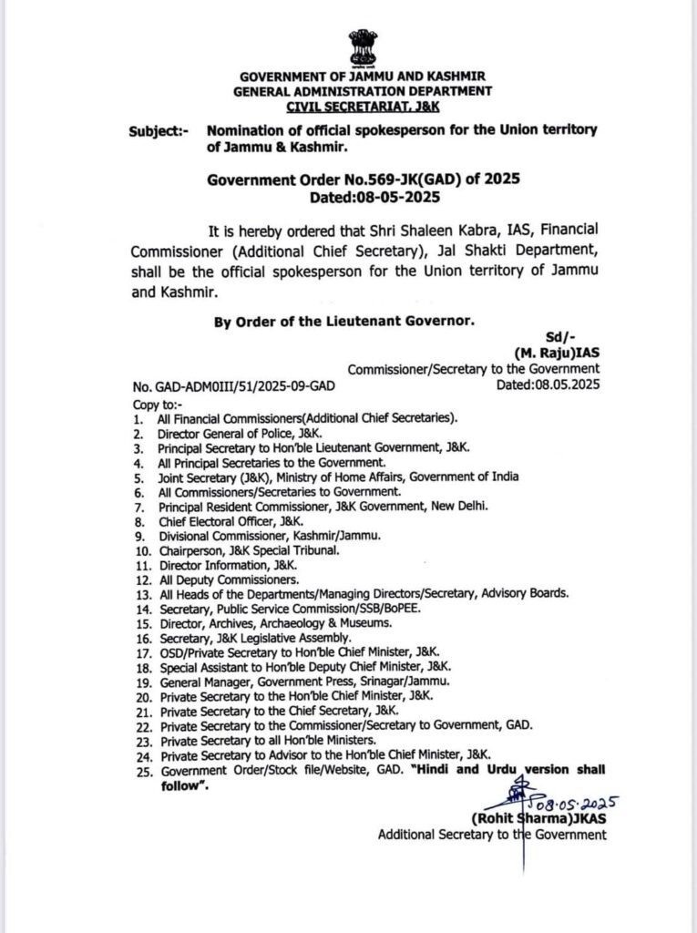 Additional Chief Secretary, Shaleen Kabra nominated as Spokesperson of J&K Govt Diplomat Digital 8 months ago