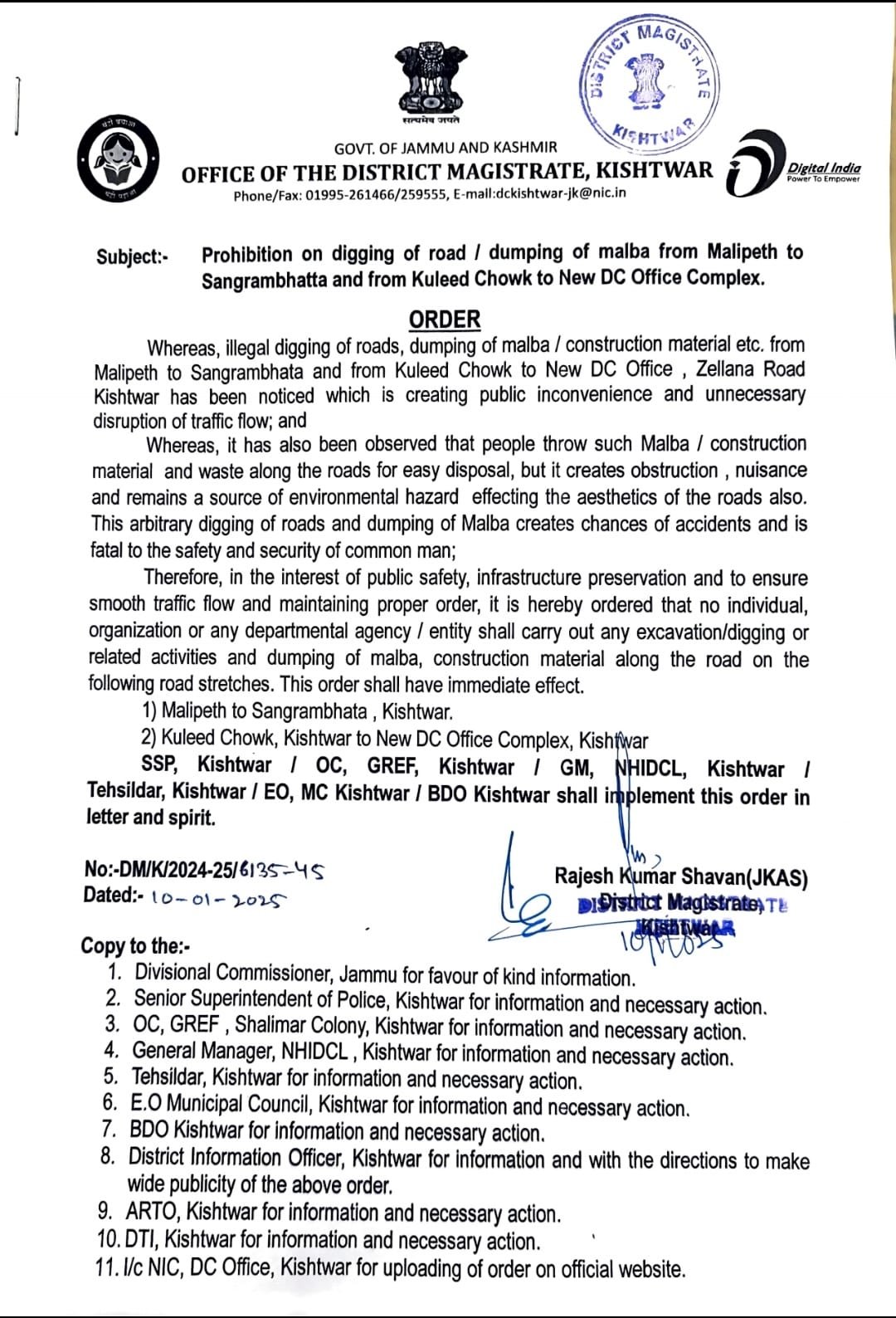 LATEST NEWS Road Safety: Night Naka Checking in Leh Expert Lecture on the topic ‘Spiritualizing Life and Living’ held at University of Jammu Jammu University celebrates Lohri in campus LG Ladakh inaugurates International Painting Symposium 2026 at IIM Jammu OP Sadbhavna : Handing Over of Newly Constructed Toilet to Gram Panchayat Khana Chargal, Jammu Chenab Valley Less than 1 min.Read Administration prohibits digging of roads, dumping malba in Kishtwar By Diplomat Digital January 10, 2025 FacebookTwitterPinterestWhatsApp The Diplomat Desk Hot this week Ladakh Road Safety: Night Naka Checking in Leh January 12, 2026 0 Diplomat Correspondent Leh: As part of the ongoing Road... Jammu Expert Lecture on the topic ‘Spiritualizing Life and Living’ held at University of Jammu January 12, 2026 0 Diplomat Correspondent Jammu: Commemorating the birth anniversary of Swami... Jammu Jammu University celebrates Lohri in campus January 12, 2026 0 Diplomat Correspondent JAMMU: Reflecting the spirit of India’s heritage... Jammu LG Ladakh inaugurates International Painting Symposium 2026 at IIM Jammu January 12, 2026 0 Diplomat Correspondent Jammu: The Lieutenant Governor of Ladakh, Kavinder... Jammu OP Sadbhavna : Handing Over of Newly Constructed Toilet to Gram Panchayat Khana Chargal, Jammu January 12, 2026 0 Diplomat Correspondent Jammu: As part of its continued commitment... Topics Ladakh Road Safety: Night Naka Checking in Leh 0 Diplomat Correspondent Leh: As part of the ongoing Road... Jammu Expert Lecture on the topic ‘Spiritualizing Life and Living’ held at University of Jammu 0 Diplomat Correspondent Jammu: Commemorating the birth anniversary of Swami... Jammu Jammu University celebrates Lohri in campus 0 Diplomat Correspondent JAMMU: Reflecting the spirit of India’s heritage... Jammu LG Ladakh inaugurates International Painting Symposium 2026 at IIM Jammu 0 Diplomat Correspondent Jammu: The Lieutenant Governor of Ladakh, Kavinder... Jammu OP Sadbhavna : Handing Over of Newly Constructed Toilet to Gram Panchayat Khana Chargal, Jammu 0 Diplomat Correspondent Jammu: As part of its continued commitment... Chenab Valley MVD Kishtwar Conducts Road Safety Programme at Paradise Skill Development Centre Kishtwar 0 Diplomat Correspondent Kishtwar, As part of National Road Safety... India DRDO Successfully Tests Man Portable Anti-Tank Guided Missile 0 Diplomat Correspondent New Delhi, DRDO successfully flight-tested the third... Jammu Executive Council Meet of Baba Ghulam Shah Badshah University Approves Various Agenda Points 0 LG directs university to focus on curriculum development and... Related Articles MVD Kishtwar Conducts Road Safety Programme at Paradise Skill Development Centre Kishtwar Chenab Valley January 12, 2026 NC Leader Shahan Sajjad Kichloo Demands Transparency in Kishtwar Power Projects Chenab Valley January 10, 2026 Disaster Response Drill Organised in Ramban to Enhance Readiness Chenab Valley January 9, 2026 Child Marriage Free India Campaign Launched in Kishtwar Chenab Valley January 9, 2026 Free Medical cum Eye Screening Camp for Drivers, Cleaners & Transporters at Chatroo Chenab Valley January 8, 2026 Previous articleOne Year Lapsed: No Update on New Panchayat Formation in J&KNext articleVISIT OF MAJ GEN ANUPINDER BEVLI, VSM, ADG JK&L DTE NCC AT 1 J&K AIR SQN NCC, Udhampur