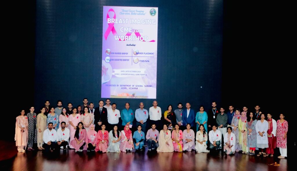 Jammu,TDD, The Department of General Surgery at AIIMS Vijaypur, Jammu, under the leadership of Prof(Dr) Shakti Kumar Gupta, ED & CEO of AIIMS Jammu organized a highly informative Continuing Medical Education (CME) and Workshop on “Latest Innovations in the Management of Breast Diseases.” The event, held on October 26, 2024, attracted an enthusiastic gathering of faculty, senior residents, nursing officers, and students from both undergraduate and postgraduate programs.