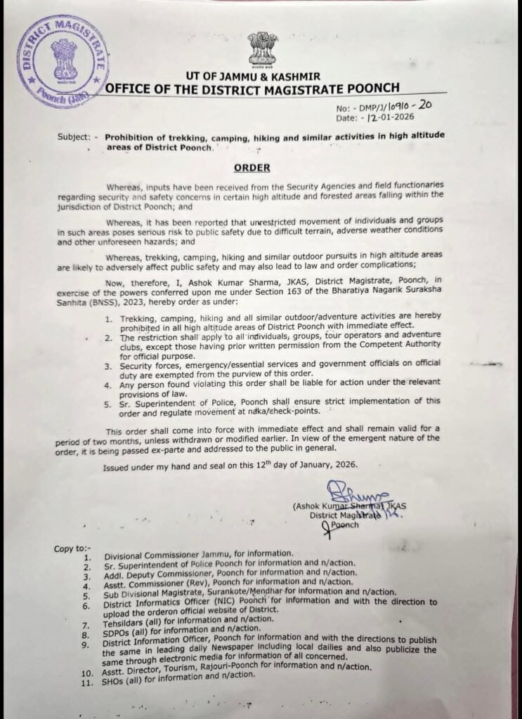 The District Magistrate of Poonch, Ashok Kumar Sharma, on January 12, 2026, prohibited trekking, camping, hiking, and all similar outdoor adventure activities in all high-altitude areas of Poonch district for a period of two months.