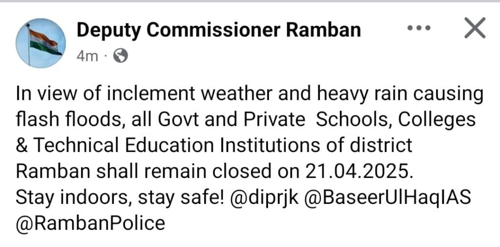 All educational institutes to remain closed in Ramban tomorrow