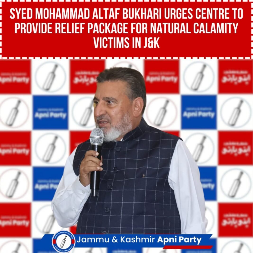 Srinagar, DD: Apni Party President Syed Mohammad Altaf Bukhari on Thursday urged the central government to announce a comprehensive relief package for those who suffered heavy losses in Jammu and Kashmir due to the recent natural calamities.