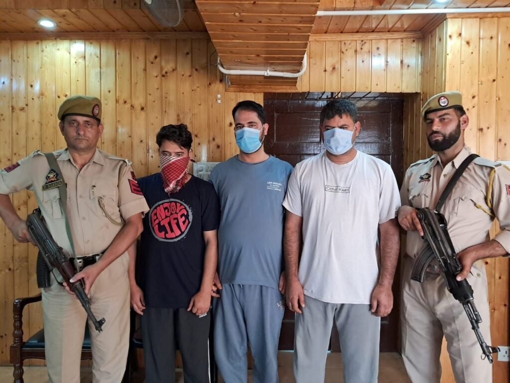 The arrested persons have been identified as Tasaduq Hussain Dar @ Haji Tasaduq, S/o Abdul Gani Dar, R/o Sadoora, Anantnag; Mohd Iqbal Wani @ Iqbal Bumdori, S/o Mohd Sikander Wani, R/o Bumdoora, Kokernag; and Mujeeb Ahmad Koka, S/o Gh Mohiuddin Koka, R/o Shankerpora, Dooru.