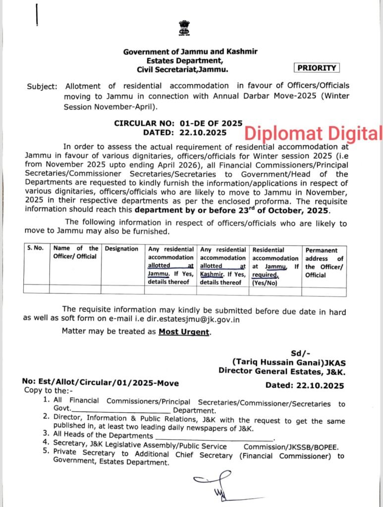 Annual Darbar Move: Allotment of residential accommodation for move officials/officers in Jammu. Diplomat Digital 3 months ago