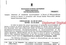Annual Darbar Move: Allotment of residential accommodation for move officials/officers in Jammu.