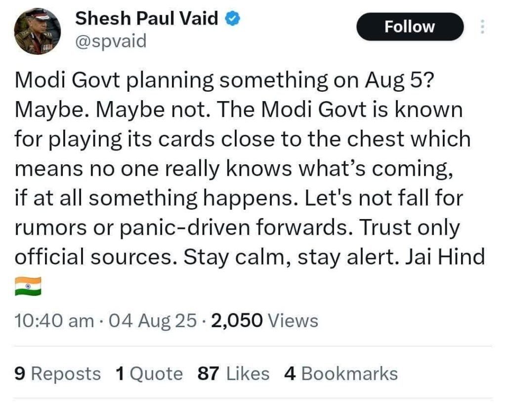 Opposition parties including, PDP have long demanded the full restoration of statehood, along with Article 370 and 35A. While most have remained guarded in their statements ahead of August 5, Omar Abdullah’s post is seen as both a signal to his support base and a subtle message to Delhi.