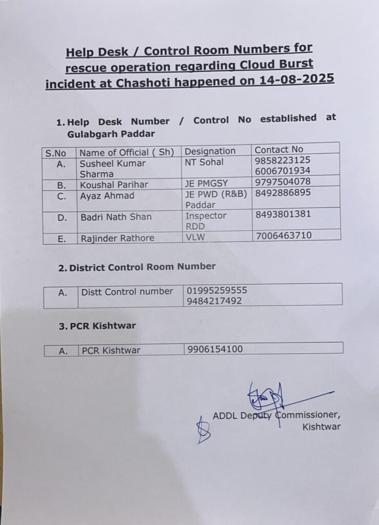 KISHTWAR: DD, District Administration Kishtwar has issued helpline numbers and established a help desk, and control room for the rescue operation and affected families.