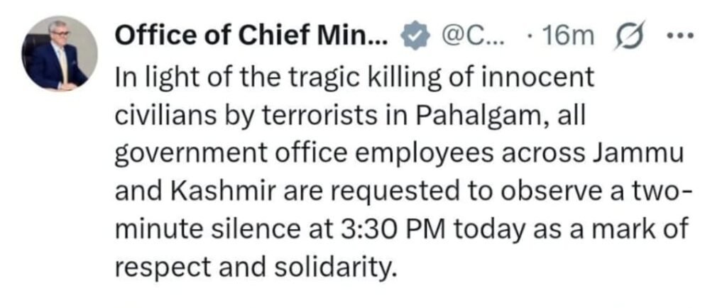 “All government offices across J&K will observe a two-minute silence at 3:30 PM today in honour of those killed in the Pahalgam tragedy. This is a moment to reflect, to mourn, and to stand together in sorrow. Kashmir shares the grief of the nation