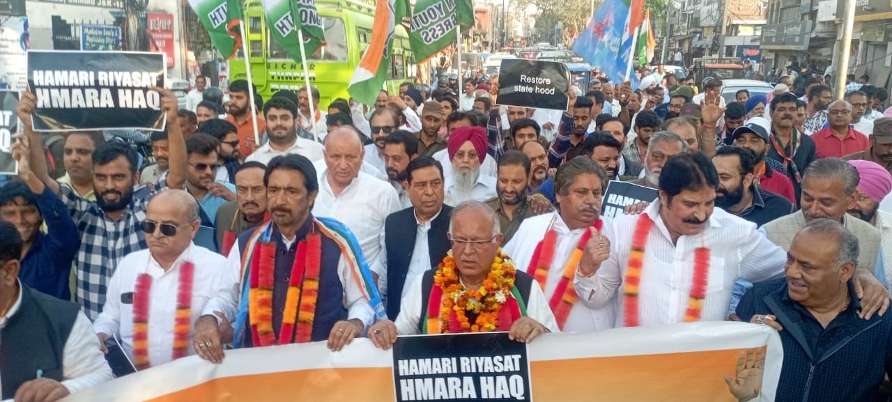 Jammu,DD: JKPCC Chief Tariq Hameed Karra accompanied by AICC General Secretary and CLP leader G A Mir besides Working Presidents Tara Chand,Raman Bhalla, DCC President Manmohan Singh Balwan Singh, ,Yogesh Sawhney, Th Hari Singh Chib, Kanta Bhan, Ved Mahajan,Th Balbir Singh, Rajnish Sharma ,Shabir Ahmed Khan , Satish Sharma, Amrit BalibSanjeev Panda and several other leaders led hundreds of Congress leaders and activists to take out a protest March from Talab Tilloo area of Jammu in support of party campaign to seek restoration of statehood at the earliest.
