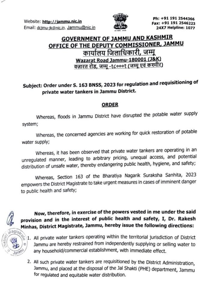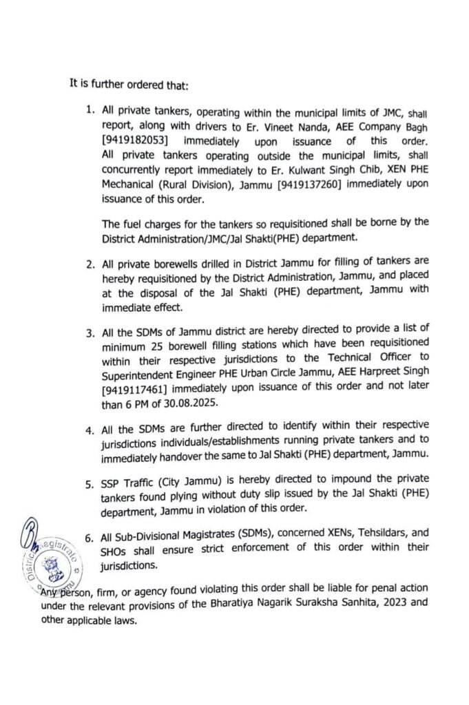 The order states that tankers operating inside Jammu Municipal Corporation limits must immediately report to designated officials, while those outside city limits must register with the PHE Mechanical Division. Fuel charges for the requisitioned tankers will be borne by the administration.