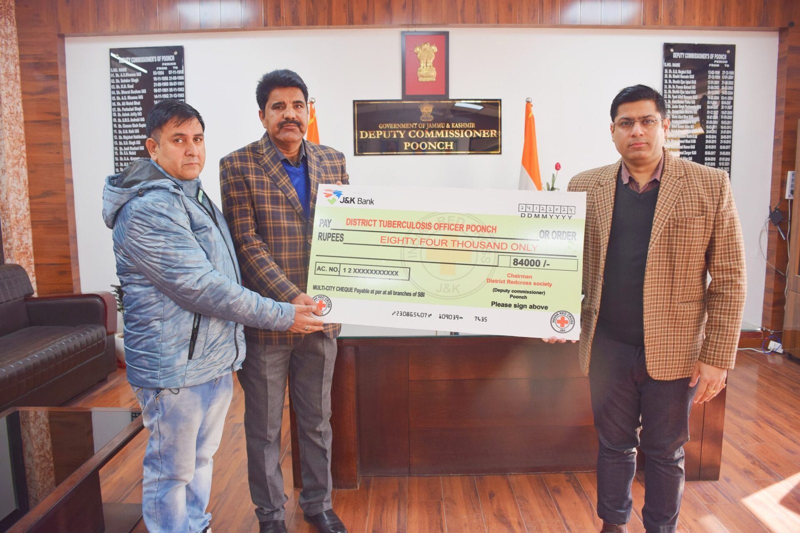 Poonch :TDD,A cheque amounting to Rs. 84,000 has been issued by the Chairman of the District Red Cross Society and Deputy Commissioner Poonch, Vikas Kundal IAS to the Chief Medical Officer Poonch Dr Parvaiz Ahmed Khan. This funding will be allocated among 28 tuberculosis (TB) patients under the Pradhan Mantri TB Mukt Bharat Abhiyan (PMTBMBA) program.