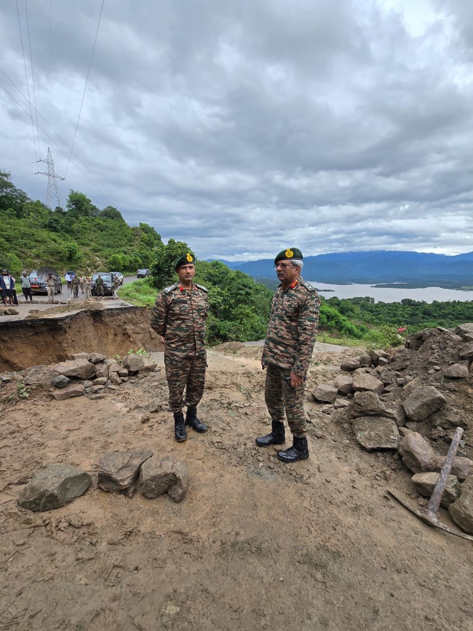 Jammu: DD, Lt Gen Raghu Srinivasan, PVSM, VSM, DGBR inspected the roads affected by the recent unprecedented rains in the UT of J&K. He visited the two strategically important roads of Ramkot-Ranjit Sagar Dam and Basholi-Bani Road. Both these roads have suffered extensive damages. He visited Pedu Nala location where two bridges were displaced owing to heavy landslides. He oversaw the construction of diversions being constructed to restore the traffic.