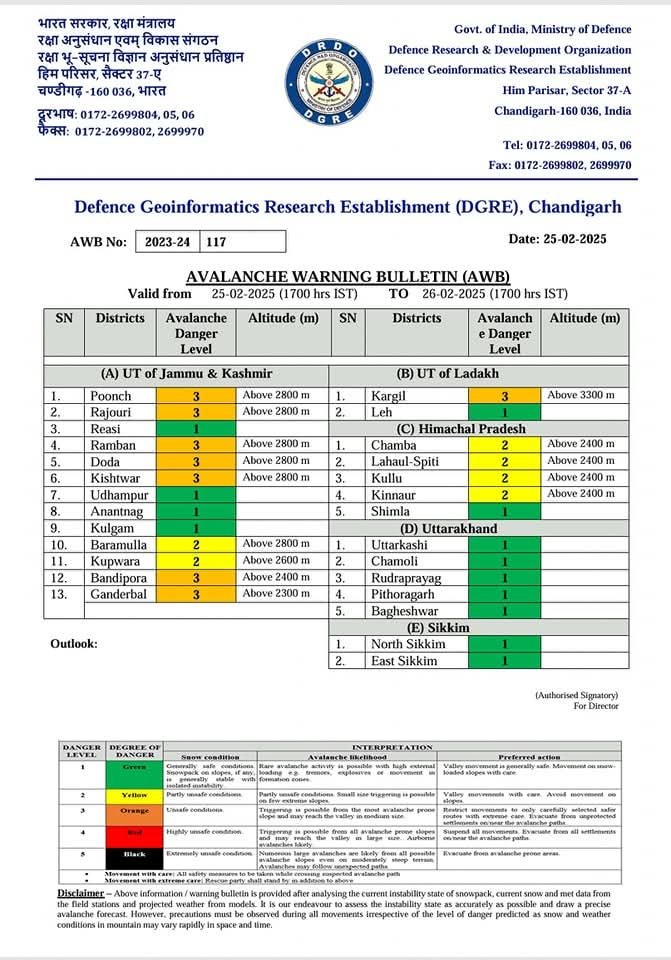 Kargil,DD: Defence Geo Informatics Research Establishment (DGRE) Chandigarh issues Level three (Orange) avalanche warning for Kargil district valid from 25-02-2025 to 26-02-2025.