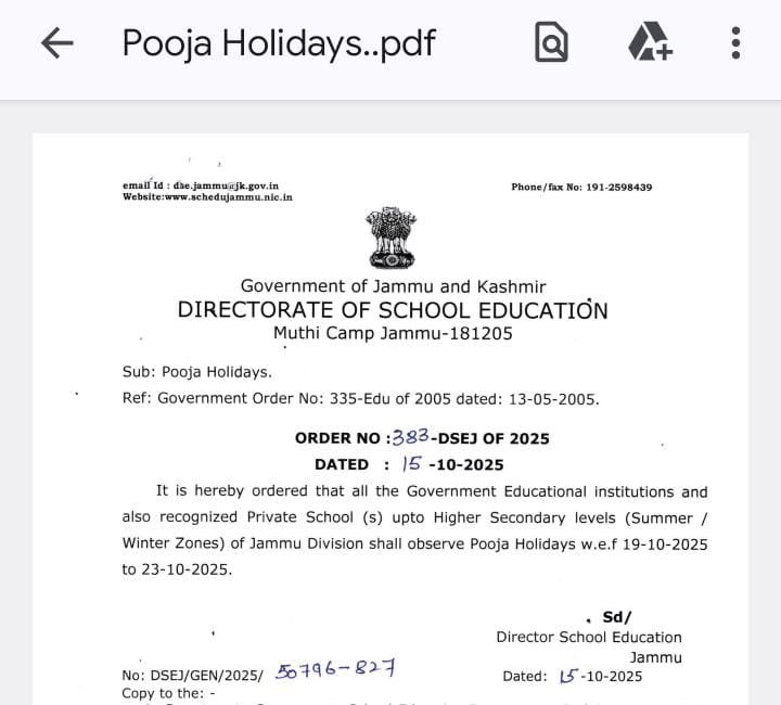 JammuKashmir Less than 1 min.Read Govt of Jammu and Kashmir/ Directorate of School Education By Diplomat Digital October 15, 2025 FacebookTwitterPinterestWhatsApp Post Views: 19 Hot this week Kashmir Apni Party ousts Muntazir Mohiuddin from party membership October 15, 2025 0 Diplomat Correspondent Srinagar, DD, Apni Party on Wednesday expelled... Jammu FORGING THE FUTURE FORCE: ARMY’S NORTHERN COMMAND CHARTS NEW FRONTIERS IN MULTI DOMAIN WARFARE October 15, 2025 0 Diplomat Correspondent Udhampur:DD, Over four days imbued with simulation of... Kashmir Lieutenant Governor visits Vajr Division’s Roshan Mustaqbil at Zangli, Kupwara October 15, 2025 0 Diplomat Correspondent Kupwara: DD, Lieutenant Governor Manoj Sinha today visited... Chenab valley Teenager Duo Drown in Chiralla Nallah October 15, 2025 0 Diplomat Correspondent Doda: DD, Two teenage boys lost their lives... Kashmir IGP Kashmir V.K Birdi promotes 650 HCs to ASIs October 15, 2025 0 Diplomat Correspondent Srinagar:DD, The Departmental Promotion Committee, constituted under... Topics Kashmir Apni Party ousts Muntazir Mohiuddin from party membership 0 Diplomat Correspondent Srinagar, DD, Apni Party on Wednesday expelled... Jammu FORGING THE FUTURE FORCE: ARMY’S NORTHERN COMMAND CHARTS NEW FRONTIERS IN MULTI DOMAIN WARFARE 0 Diplomat Correspondent Udhampur:DD, Over four days imbued with simulation of... Kashmir Lieutenant Governor visits Vajr Division’s Roshan Mustaqbil at Zangli, Kupwara 0 Diplomat Correspondent Kupwara: DD, Lieutenant Governor Manoj Sinha today visited... Chenab valley Teenager Duo Drown in Chiralla Nallah 0 Diplomat Correspondent Doda: DD, Two teenage boys lost their lives... Kashmir IGP Kashmir V.K Birdi promotes 650 HCs to ASIs 0 Diplomat Correspondent Srinagar:DD, The Departmental Promotion Committee, constituted under... Kashmir Kulgam Police Attaches Property of Detained Drug Peddler/Supplier under NDPS Act 0 Diplomat Correspondent Kulgam: DD, In a major action against drug... Jammu Govt Declares Pooja Holidays from Oct 19-23 for Schools in Jammu Division 0 Diplomat Correspondent Jammu: DD, Director School Education Jammu has ordered... Kashmir Anantnag Court Convicts Man in POCSO, Rape Case; Sentencing on Oct 22 0 Diplomat Correspondent Srinagar: DD, A local court in Anantnag on... Related Articles Apni Party ousts Muntazir Mohiuddin from party membership Kashmir October 15, 2025 FORGING THE FUTURE FORCE: ARMY’S NORTHERN COMMAND CHARTS NEW FRONTIERS IN MULTI DOMAIN WARFARE Jammu October 15, 2025 Lieutenant Governor visits Vajr Division’s Roshan Mustaqbil at Zangli, Kupwara Kashmir October 15, 2025 IGP Kashmir V.K Birdi promotes 650 HCs to ASIs Kashmir October 15, 2025 Kulgam Police Attaches Property of Detained Drug Peddler/Supplier under NDPS Act Kashmir October 15, 2025 Popular Categories JammuKashmirChenab valleyLadakhPir PanjalNational Previous articleBJP Announces Candidates for Assembly Bypolls in J&K and Other StatesNext articleArmy Attachment Camp Concludes at Digiana, Jammu