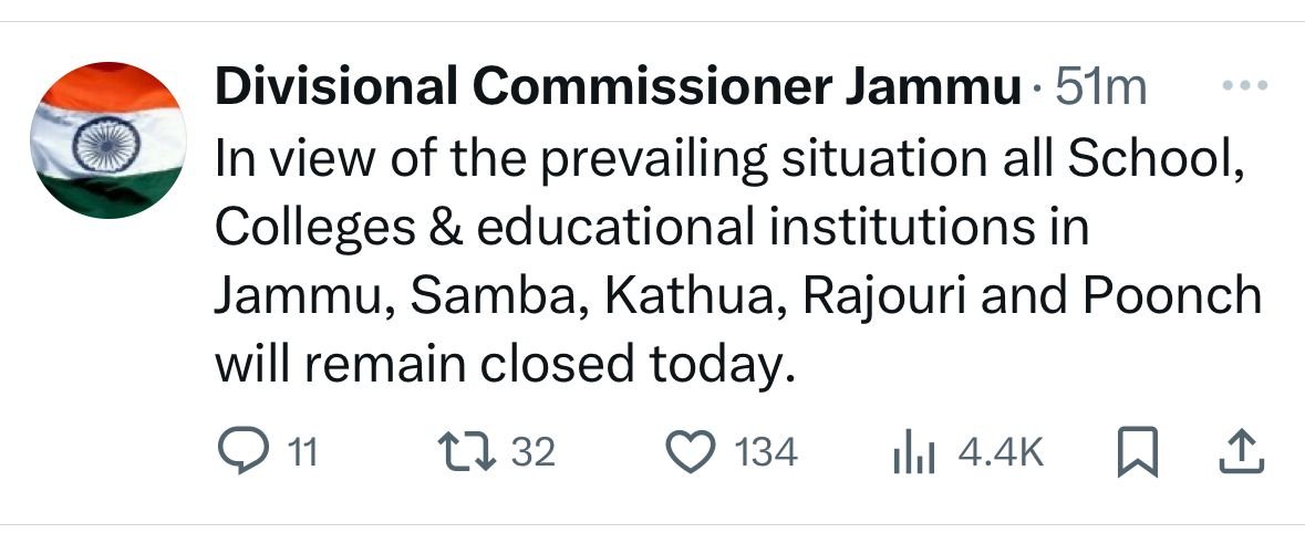 LATEST NEWS Missed words and lost voices intermingle throughout stratified histories of Rampur Bahu Fort Residents Seek Extension of Smart City E-Bus Services Housing Security and Tax Fairness: Parliament Must Deliver Beyond Debate Indian Army’s Medical Patrol Wins Trust of Local Population in Jammu Region Advanced Management Development Programme under ESDP–DCMSME Inaugurated in IIM Jammu Jammu Less than 1 min.Read Div Com Jammu orders closing of all educational institutes in Jammu, Samba, Kathua, Rajouri and Poonch By Diplomat Digital May 7, 2025 FacebookTwitterPinterestWhatsApp Hot this week Features Missed words and lost voices intermingle throughout stratified histories of Rampur February 10, 2026 0 Other stories come like the whispers of the past,... Jammu Bahu Fort Residents Seek Extension of Smart City E-Bus Services February 10, 2026 0 Jammu: Residents of the historic Bahu Fort area have... Edit/Opinion Housing Security and Tax Fairness: Parliament Must Deliver Beyond Debate February 10, 2026 0 The issues of housing insecurity among the urban poor... Jammu Indian Army’s Medical Patrol Wins Trust of Local Population in Jammu Region February 10, 2026 0 Akhnoor: The Indian Army has continued its medical patrols... Jammu Advanced Management Development Programme under ESDP–DCMSME Inaugurated in IIM Jammu February 9, 2026 0 Jammu, J&K (India): The Indian Institute of Management (IIM)... Topics Features Missed words and lost voices intermingle throughout stratified histories of Rampur 0 Other stories come like the whispers of the past,... Jammu Bahu Fort Residents Seek Extension of Smart City E-Bus Services 0 Jammu: Residents of the historic Bahu Fort area have... Edit/Opinion Housing Security and Tax Fairness: Parliament Must Deliver Beyond Debate 0 The issues of housing insecurity among the urban poor... Jammu Indian Army’s Medical Patrol Wins Trust of Local Population in Jammu Region 0 Akhnoor: The Indian Army has continued its medical patrols... Jammu Advanced Management Development Programme under ESDP–DCMSME Inaugurated in IIM Jammu 0 Jammu, J&K (India): The Indian Institute of Management (IIM)... India India–Greece Deepen Strategic Partnership During High-Level Defence Talks in New Delhi 0 New Delhi: Indian Defence Minister Rajnath Singh today held... Edit/Opinion The Nation’s Water, the Nation’s Light and Prosperity 0 It is a welcome and far-reaching step that serious... Features Exploration of colour and memory 0 The Yellow Metaphor, a poetry collection by Jiban Narah... Related Articles Bahu Fort Residents Seek Extension of Smart City E-Bus Services Jammu February 10, 2026 Indian Army’s Medical Patrol Wins Trust of Local Population in Jammu Region Jammu February 10, 2026 Advanced Management Development Programme under ESDP–DCMSME Inaugurated in IIM Jammu Jammu February 9, 2026 Anjumans holds Protest in Jammu Against Shia Genocide in Pakistan Jammu February 8, 2026 The Indelible Hills: Why Pir Panjal and Chenab Valley Cannot Be Erased Article February 6, 2026 Previous articleLoC witnessed “deadly night” with heavy cross border fire from PakistanNext articleThree lost lives in Pak shelling: Army