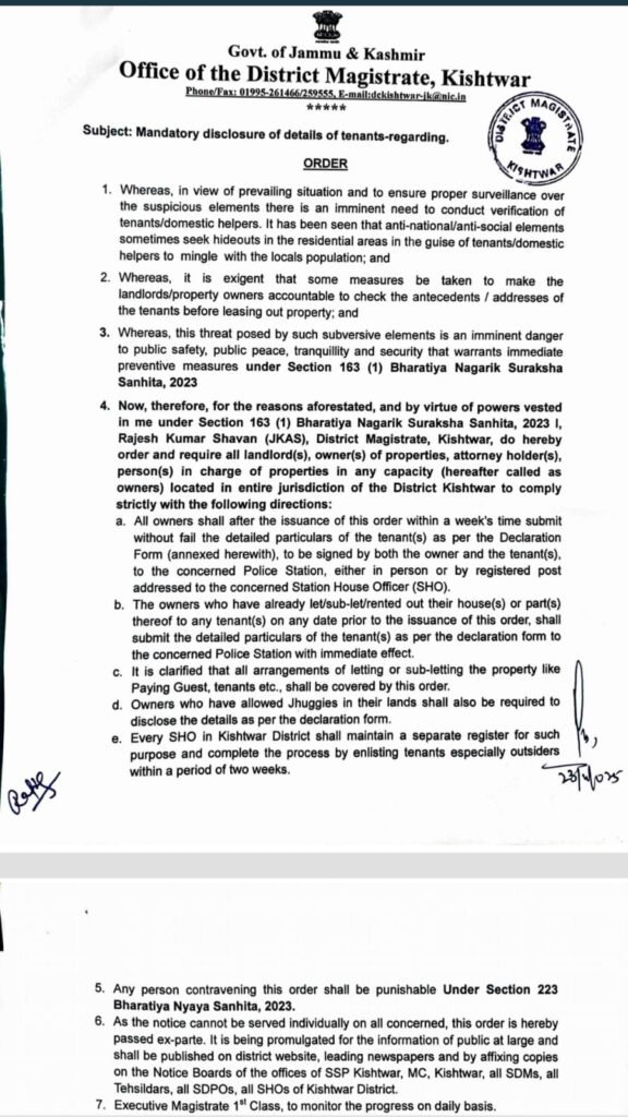 DM Kishtwar orders mandatory disclosure of tenants details