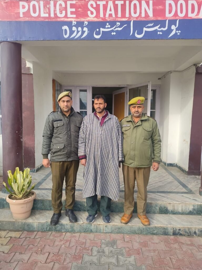 Giving details Police said that one accused namely Mohd Amran Malla S/o Mohd Afzal Malla R/o Harpura tehsil kokernag Distt anantnag was involved in a theft case FIR No.185/2014 U/S 457/380 RPC registered against him in Police Station Doda and finally the case was Challaned in the year, 2015. The said accused person was declared as absconder by the Hon’ble court of law and general warrant of arrest under section 299 Cr.P.C was issued against him. But he was evading his arrest since 2016.