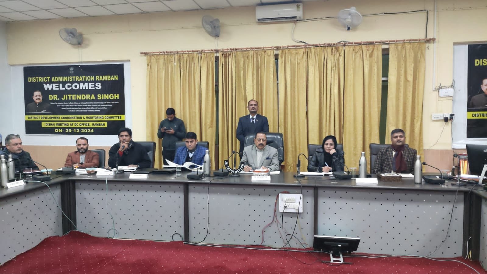 RAMBAN, TDD : Union Minister Dr Jitendra Singh chaired the District Development Coordination and Monitoring Committee Meeting (DISHA) here today in the office of Deputy Commissioner to review the status of ongoing projects and public welfare schemes. Speaking on the occasion,