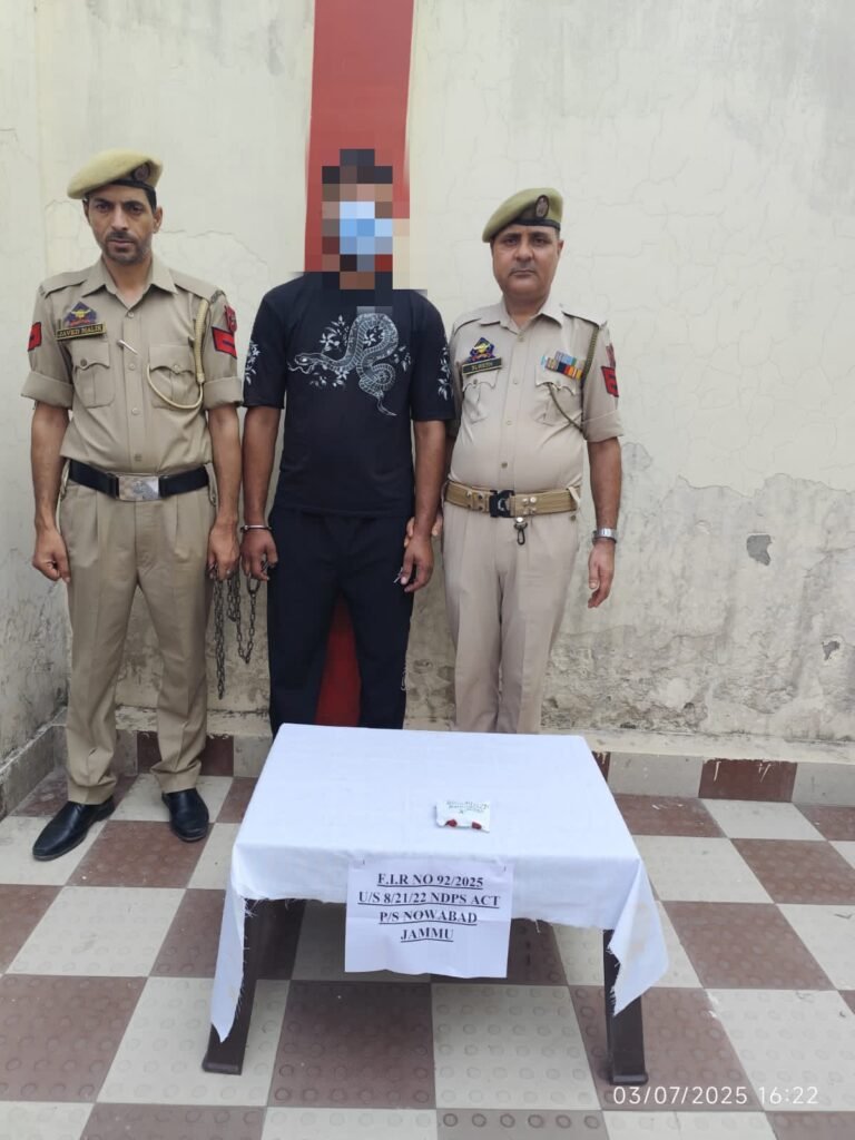Police team led by PSI Paramjeet Singh IC PP Talab Tillo made the arrest, recovery and seizure under the supervision of Inspector Deepak Pathania SHO Nowabad, Farha Nishat DSP Headquarters and Vivek Shekhar S P City North Jammu. (Press Release)