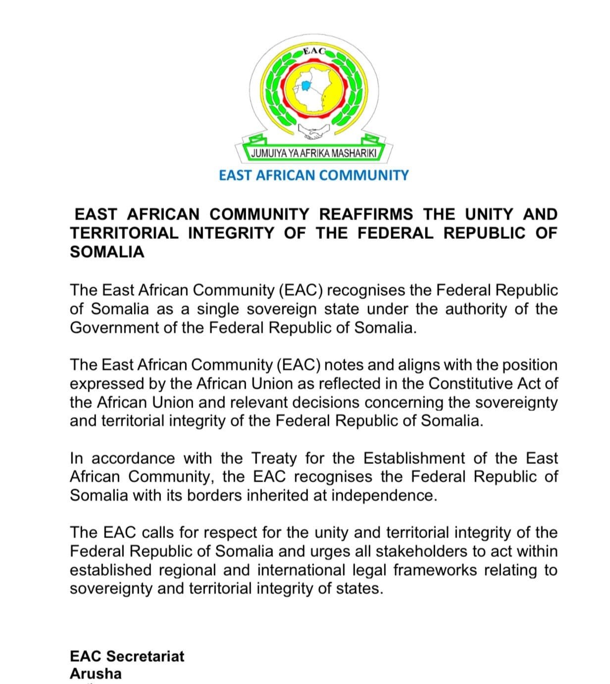 The EAC calls for respect for the unity and territorial integrity of the Federal Republic of Somalia and urges all stakeholders to act within established regional and international legal frameworks relating to sovereignty and territorial integrity of states.