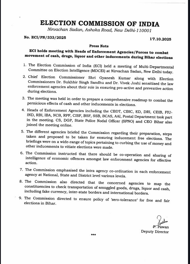 National Less than 1 min.Read Election commission of India By Diplomat Digital October 17, 2025 FacebookTwitterPinterestWhatsApp Post Views: 4 Hot this week Ladakh Restrictions Imposed in Leh Under Section 163 of Bharatiya Nagarik Suraksha Sanhita October 17, 2025 0 Diplomat Correspondent Leh: DD, Authorities in Leh on Friday imposed... Jammu BJP VDG Cell Seeks Govt Job, support For Deceased VDG’s Families October 17, 2025 0 Diplomat Correspondent Jammu,DD: BJP VDG Cell State Convener Basant Raj... Pir Panjal Indian Army Organises Volleyball, Community Engagement at Seri, Rajouri October 17, 2025 0 Diplomat Correspondent Rajouri, DD, As part of its ongoing efforts... Ladakh Zonal Level Cooking Competition held at ZEO Office, Khaltse October 17, 2025 0 Diplomat Correspondent Khaltse:DD, A Zonal Level Cooking Competition under... Ladakh Sheep Husbandry Department Flags Off Livestock Owners for Exposure Tour October 17, 2025 0 Diplomat Correspondent Leh:DD, The Sheep Husbandry Department, Leh, today... Topics Ladakh Restrictions Imposed in Leh Under Section 163 of Bharatiya Nagarik Suraksha Sanhita 0 Diplomat Correspondent Leh: DD, Authorities in Leh on Friday imposed... Jammu BJP VDG Cell Seeks Govt Job, support For Deceased VDG’s Families 0 Diplomat Correspondent Jammu,DD: BJP VDG Cell State Convener Basant Raj... Pir Panjal Indian Army Organises Volleyball, Community Engagement at Seri, Rajouri 0 Diplomat Correspondent Rajouri, DD, As part of its ongoing efforts... Ladakh Zonal Level Cooking Competition held at ZEO Office, Khaltse 0 Diplomat Correspondent Khaltse:DD, A Zonal Level Cooking Competition under... Ladakh Sheep Husbandry Department Flags Off Livestock Owners for Exposure Tour 0 Diplomat Correspondent Leh:DD, The Sheep Husbandry Department, Leh, today... Kashmir Judicial Academy Srinagar organizes orientation programme on “Medical Forensics & Medico-Legal Aspects in Trial” 0 Diplomat Correspondent SRINAGAR, DD, The Jammu & Kashmir Judicial Academy,... Jammu Secretary Transport visits IDTR Kot Bhalwal Jammu 0 Diplomat Correspondent JAMMU, DD: Secretary, Transport department, Avny Lavasa today... Kashmir Speaker engages with Media persons in Pre-Assembly session talks 0 Highlights role of media in fostering informed public discourse... Related Articles Centre Orders Judicial Inquiry Into Leh Police Firing Incident National October 17, 2025 Need for a structured policy framework to strengthen India’s domestic industrial base: Defence Secretary National October 17, 2025 Raksha Mantri-led Consultative Committee on Defence visits ARDE, a premier armament laboratory of DRDO, in Pune National October 16, 2025 AG Nods for Contempt Proceedings Against Lawyer in Shoe-Hurling Incident National October 16, 2025 Raksha Mantri holds a meeting with Vice President and Defence Minister of Brazil in New Delhi National October 15, 2025 Popular Categories JammuKashmirChenab valleyLadakhPir PanjalNational Previous articleBJP VDG Cell Seeks Govt Job, support For Deceased VDG’s FamiliesNext articleRestrictions Imposed in Leh Under Section 163 of Bharatiya Nagarik Suraksha Sanhita