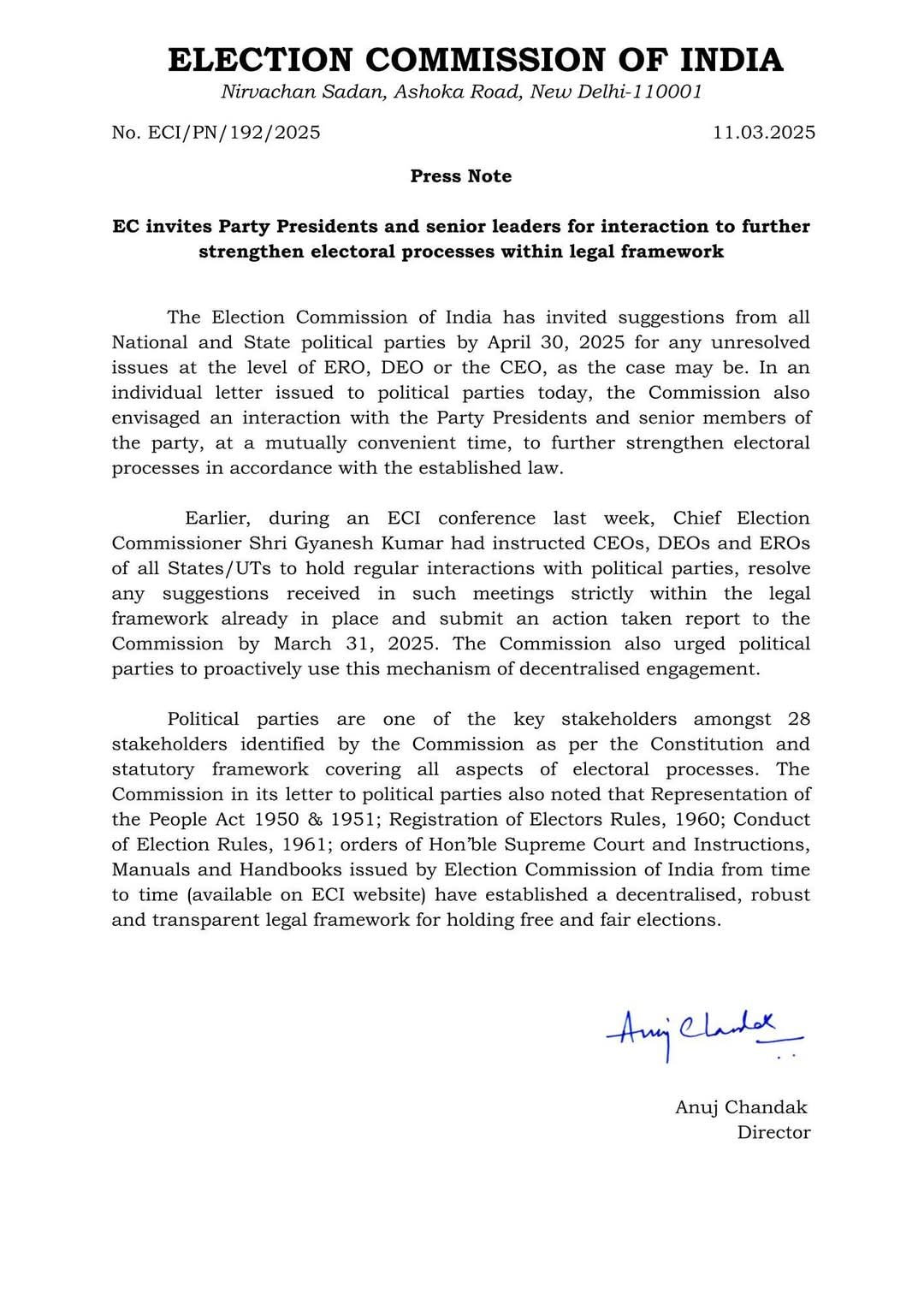 LATEST NEWS Conduct of Mega Medical Camp at Piri, Rajouri COAS Visits World Book Fair, New Delhi Metamorphosis of Mindsets: EXPA Cadet Program at Ek Bharat Shreshtha Bharat Camp Amit mentions Census 2027 a founding pillar of Viksit Bharat in 6th Digital Transformation Summit & Awards Cold Climes, Warm Bonds: EBSB Camp at NCC Training Academy Nagrota Celebrates Unity in Diversity India Less than 1 min.Read Election Commission of India invites Party Presidents and senior leaders for interaction to further strengthen electoral processes within legal framework. By Diplomat Digital March 11, 2025 FacebookTwitterPinterestWhatsApp Hot this week Pir Panjal Conduct of Mega Medical Camp at Piri, Rajouri January 17, 2026 0 Diplomat Correspondent Rajouri: Indian Army conducted a Mega Medical... India COAS Visits World Book Fair, New Delhi January 17, 2026 0 Diplomat Correspondent New Delhi : General Upendra Dwivedi, Chief... Jammu Metamorphosis of Mindsets: EXPA Cadet Program at Ek Bharat Shreshtha Bharat Camp January 17, 2026 0 Diplomat Correspondent Jammu: Stepping into a two-day transformative journey,... India Amit mentions Census 2027 a founding pillar of Viksit Bharat in 6th Digital Transformation Summit & Awards January 17, 2026 0 Diplomat Correspondent New Delhi, Amit Sharma, IAS, Director... Jammu Cold Climes, Warm Bonds: EBSB Camp at NCC Training Academy Nagrota Celebrates Unity in Diversity January 17, 2026 0 Diplomat Correspondent Nagrota: Ek Bharat Shreshtha Bharat Jammu at... Topics Pir Panjal Conduct of Mega Medical Camp at Piri, Rajouri 0 Diplomat Correspondent Rajouri: Indian Army conducted a Mega Medical... India COAS Visits World Book Fair, New Delhi 0 Diplomat Correspondent New Delhi : General Upendra Dwivedi, Chief... Jammu Metamorphosis of Mindsets: EXPA Cadet Program at Ek Bharat Shreshtha Bharat Camp 0 Diplomat Correspondent Jammu: Stepping into a two-day transformative journey,... India Amit mentions Census 2027 a founding pillar of Viksit Bharat in 6th Digital Transformation Summit & Awards 0 Diplomat Correspondent New Delhi, Amit Sharma, IAS, Director... Jammu Cold Climes, Warm Bonds: EBSB Camp at NCC Training Academy Nagrota Celebrates Unity in Diversity 0 Diplomat Correspondent Nagrota: Ek Bharat Shreshtha Bharat Jammu at... Jammu Div Com and IGP Jammu review arrangements at M A stadium 0 Diplomat Correspondent JAMMU: Divisional Commissioner Jammu, Ramesh Kumar and... Jammu Know where the Power to remain shutdown 0 Diplomat Correspondent JAMMU, Chief Engineer (Distribution) JPDCL Jammu... Jammu CBI Arrests Two Public Servants in Bribery Case 0 Diplomat CorrespondentJammu: The Central Bureau of Investigation (CBI) has... Related Articles COAS Visits World Book Fair, New Delhi India January 17, 2026 Amit mentions Census 2027 a founding pillar of Viksit Bharat in 6th Digital Transformation Summit & Awards India January 17, 2026 Indian Army Signs MOU with Podar Education Network to Support Wards of Soldiers India January 16, 2026 Chief of Army Staff Visits NCC Republic Day Camp 2026 India January 16, 2026 Property of Pakistan-Based Terror Handler attached in Poonch India January 15, 2026 Previous articleNo Proposal for New Police District in Uri, Baramulla: CentreNext articleJ&K Govt Approves Rs 1022.63 Crore for 194 Road, Bridge Projects in UT