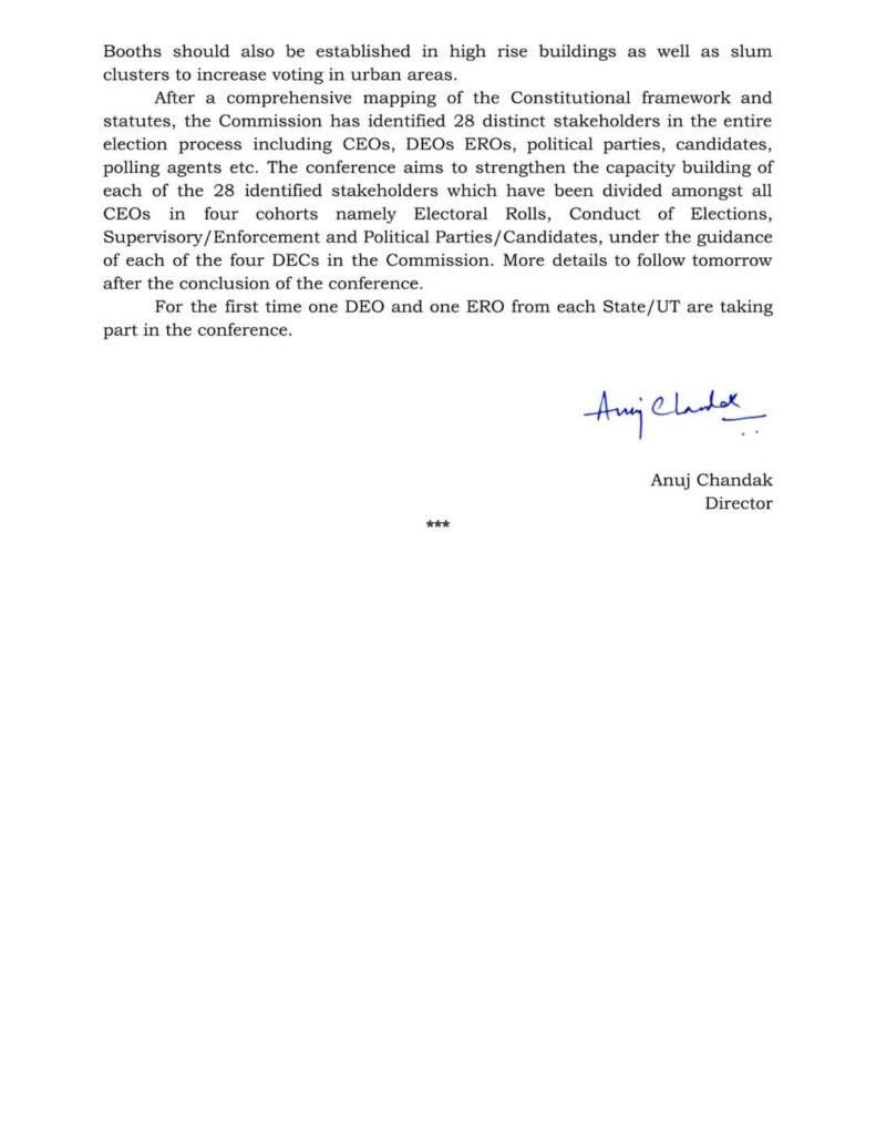 Election Commission today began 2 day conference of CEOs of all States/ UTs at IIIDEM New Delhi. All CEOs, DEOs, EROs were directed to hold political party meetings regularly and resolve issues within statutory frameworks.