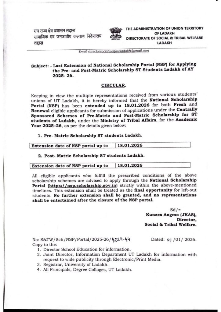 The National Scholarship Portal (NSP) has been extended up to 18.01.2026 for Fresh & Renewal applications under Pre- and Post-Matric Scholarships for ST students of Ladakh (Ministry of Tribal Affairs).