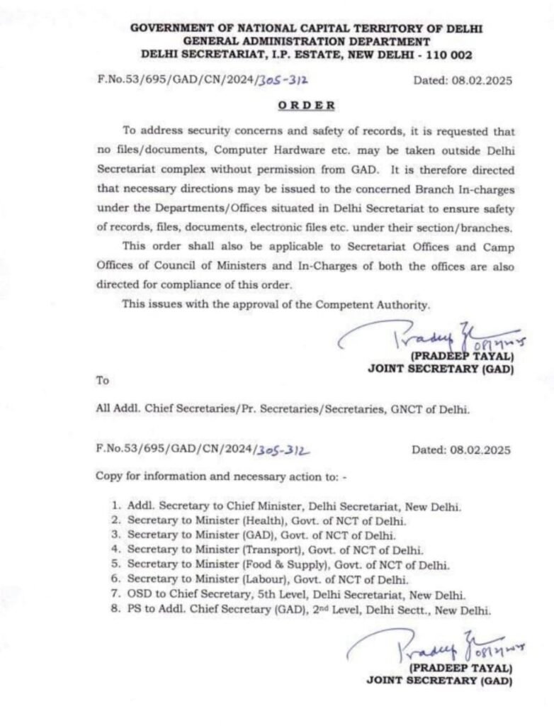 As per the order signed by Joint Secretary (GAD) Pradeep Tayal, no files, documents or computer hardware can be taken out of the Delhi Secretariat complex without explicit permission from GAD. The order is applicable to all departments and offices in the Delhi Secretariat, covering the Secretariat Offices and Camp Offices of the Council of Ministers.