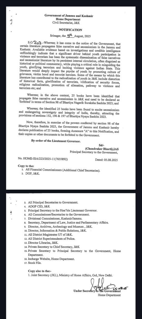 According to official sources, the banned books—written by various authors and publishers—allegedly contained misleading historical accounts, glorified militancy, and questioned the sovereignty of India over Jammu and Kashmir. The Home Department invoked relevant provisions under law to prohibit the publication, distribution, and sale of these materials within the region.
