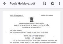 Diplomat Correspondent Jammu: DD, Director School Education Jammu has ordered the closure of all Government and recognized private schools across Jammu Division on account of upcoming Pooja holidays. In an order issued by DSEJ, the holidays will be observed from October 19 to October 23, 2025, covering institutions up to the Higher Secondary level in … Continue reading Govt Declares Pooja Holidays from Oct 19-23 for Schools in Jammu Division