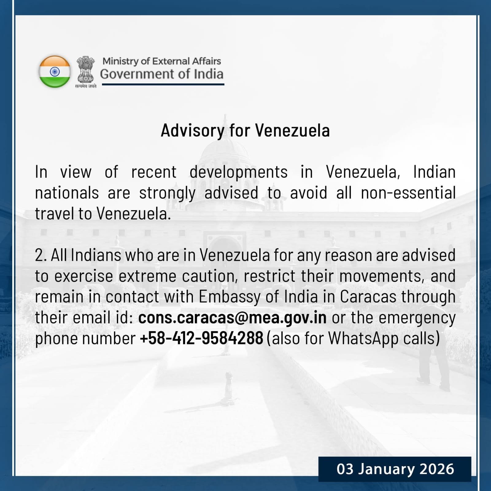 Govt of India Issues Advisory for Indian Nationals to Avoid All Non-Essential Travel to Venezuela
