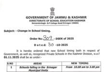 Diplomat Correspondent Srinagar: DD, The Directorate of School Education, Kashmir, has issued new timings for schools across the Kashmir Division, effective November 1, 2025. According to the order (No. 309-DSEK of 2025) as per news agency Kashmir News Corner — KNC, schools within Srinagar Municipal limits will now function from 10:00 am to 3:00 pm, … Continue reading School Timings Revised Across Kashmir Division, Effective Nov 1
