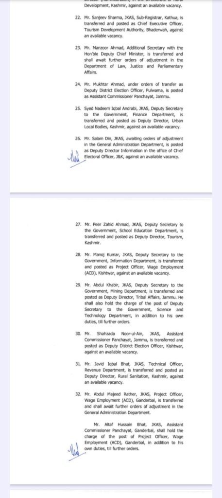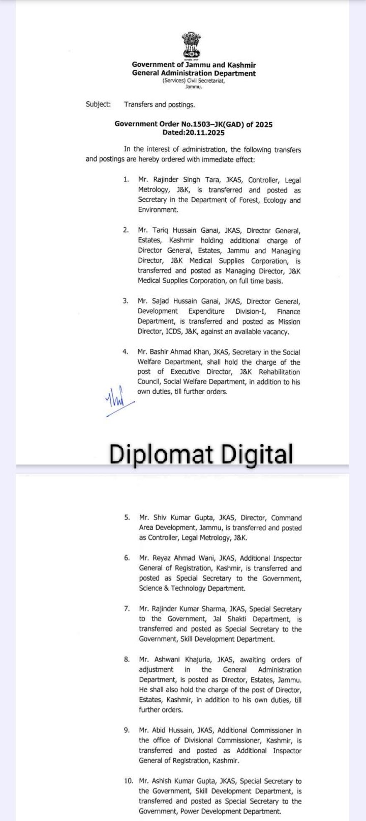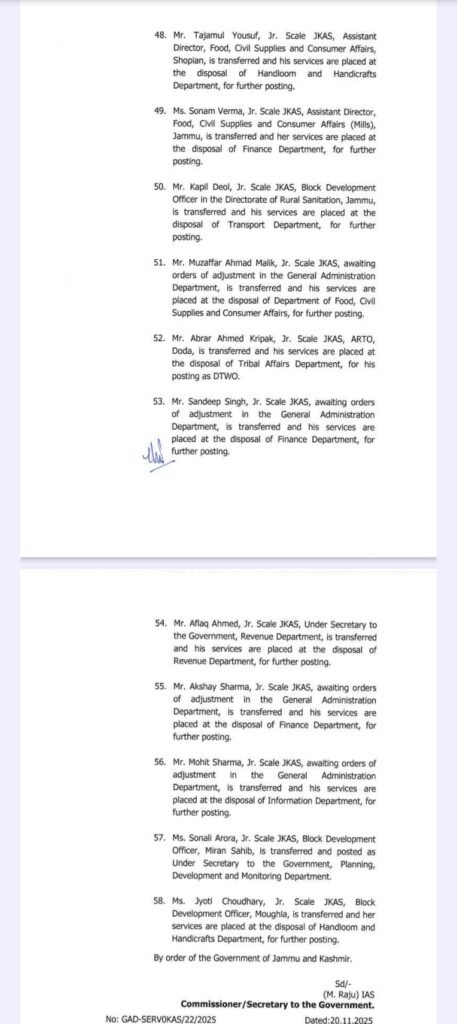 LATEST NEWS CBI Arrests Two Public Servants in Bribery Case JU organizes General Zorawar Singh Memorial Public Lecture on “China’s Cognitive Warfare Ecosystem: Implications and Response by India” Indian Army Signs MOU with Podar Education Network to Support Wards of Soldiers DPC process to go digital soon; CS takes appraisal of the portal Lieutenant Governor Manoj Sinha Inaugurates Exhibition at IIM Oplus_0 JammuKashmir Less than 1 min.Read Govt orders transfer of 58 JKAS officers By Diplomat Digital November 20, 2025 FacebookTwitterPinterestWhatsApp Hot this week Jammu CBI Arrests Two Public Servants in Bribery Case January 16, 2026 0 Diplomat CorrespondentJammu: The Central Bureau of Investigation (CBI) has... Jammu JU organizes General Zorawar Singh Memorial Public Lecture on “China’s Cognitive Warfare Ecosystem: Implications and Response by India” January 16, 2026 0 Diplomat Correspondent Jammu: The Department of Strategic and Regional... India Indian Army Signs MOU with Podar Education Network to Support Wards of Soldiers January 16, 2026 0 Diplomat Correspondent New Delhi: The Indian Army has signed... Jammu DPC process to go digital soon; CS takes appraisal of the portal January 16, 2026 0 Diplomat Correspondent JAMMU: Chief Secretary, Atal Dulloo, today took... Jammu Lieutenant Governor Manoj Sinha Inaugurates Exhibition at IIM January 16, 2026 0 Diplomat Correspondent Jammu, Jammu’s International Painters Symposium 2026 Valedictory... Topics Jammu CBI Arrests Two Public Servants in Bribery Case 0 Diplomat CorrespondentJammu: The Central Bureau of Investigation (CBI) has... Jammu JU organizes General Zorawar Singh Memorial Public Lecture on “China’s Cognitive Warfare Ecosystem: Implications and Response by India” 0 Diplomat Correspondent Jammu: The Department of Strategic and Regional... India Indian Army Signs MOU with Podar Education Network to Support Wards of Soldiers 0 Diplomat Correspondent New Delhi: The Indian Army has signed... Jammu DPC process to go digital soon; CS takes appraisal of the portal 0 Diplomat Correspondent JAMMU: Chief Secretary, Atal Dulloo, today took... Jammu Lieutenant Governor Manoj Sinha Inaugurates Exhibition at IIM 0 Diplomat Correspondent Jammu, Jammu’s International Painters Symposium 2026 Valedictory... Ladakh DGP Ladakh Mukesh calls on LG Kavinder Gupta in Leh 0 Diplomat Correspondent Leh: Director General of Police, Union Territory... Jammu Veterans’ Rally was Organised by the Crossed Swords Division at Tanda, Akhnoor 0 Diplomat Correspondent Akhnoor: A mega Veterans’ rally was organised... Jammu Congress Reviews Mass Outreach Campaigns, Flags Governance Failures and Local Issues 0 Diplomat Correspondent Jammu: The Congress Party today held an... Related Articles CBI Arrests Two Public Servants in Bribery Case Jammu January 16, 2026 JU organizes General Zorawar Singh Memorial Public Lecture on “China’s Cognitive Warfare Ecosystem: Implications and Response by India” Jammu January 16, 2026 DPC process to go digital soon; CS takes appraisal of the portal Jammu January 16, 2026 Lieutenant Governor Manoj Sinha Inaugurates Exhibition at IIM Jammu January 16, 2026 Veterans’ Rally was Organised by the Crossed Swords Division at Tanda, Akhnoor Jammu January 16, 2026 Previous articlePM-KISAN 21st Instalment Released | Live Event at Highest KVK in IndiaNext articleIndian Army Organises Lecture on Road Safety Awareness at Kotranka, Rajouri