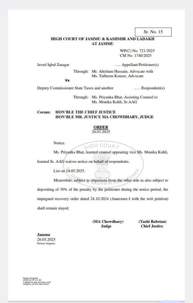 Jammu:DD, In a significant development, the High Court of Jammu and Kashmir and Ladakh at Jammu has granted interim relief in the case filed by Javed Iqbal Zaragar against the Deputy Commissioner of State Taxes and others in penalty recovery of more than 80 lakh s
