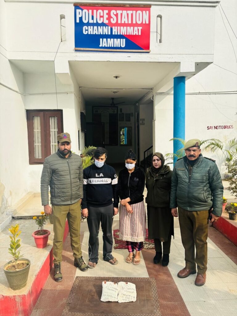 Jammu :TDD,Jammu and Kashmir Police apprehended two notorious drug peddlers Rahul Singh Jamwal S/O Late Romesh Singh Jamwal R/O Rama Channi and his wife Shagun Chandel @ Tannu Jamwal W/O Rahul Singh Jamwal resident of Rama Channi and recovered 28 grams of heroin (Chitta) from their possession during Patrolling/Naka in Channi Himmat area.