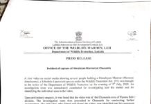 Diplomat Correspondent Ladakh,DD, A viral video on social media showing several people holding a Himalayan Marmot (Marmota himalayana), a Schedule-l protected species under the Wildlife Protection Act, 1972 was brought to the notice of the Department of Wildlife Protection on the evening of 9th July, 2025.An investigation team was immediately constituted for investigating into the … Continue reading Incident of capture of Himalayan Marmot at Chusumla