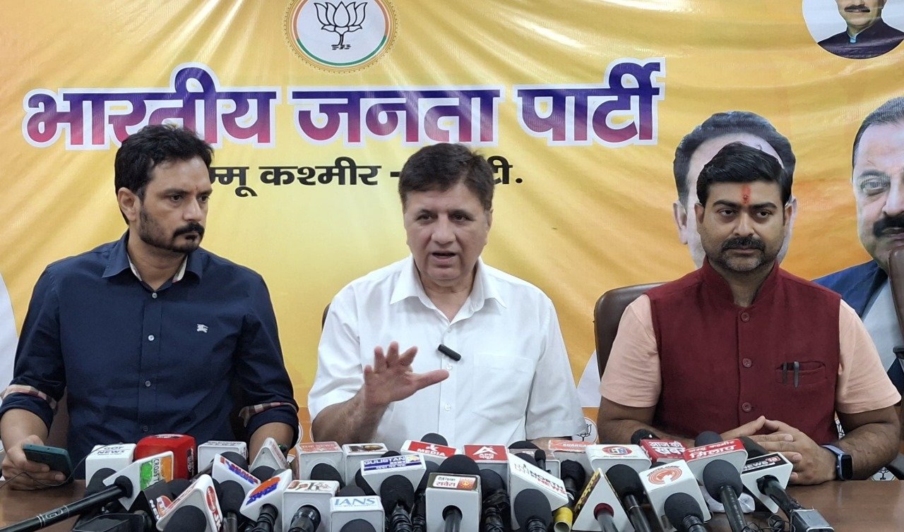 Jammu:DD, Adv. Sunil Sethi, Chief Spokesperson, J&K BJP accompanied by Dr. Abhijeet Jasrotia, Spokesperson, and Dr. Pardeep Mahotra, Media Incharge, J&K BJP was addressing a press conference at party headquarters, Trikuta Nagar, Jammu.