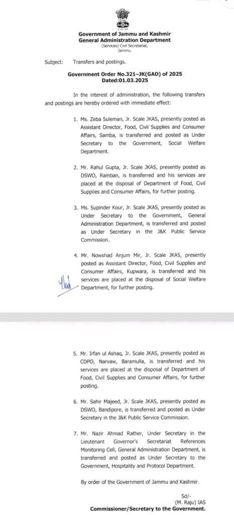 J&K GAD orders 7 transfers & postings of officers