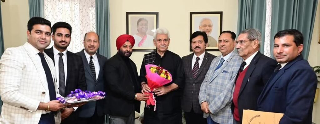 Jammu:DD, A delegation of Jammu and Kashmir High Court Bar Association Jammu, led by its President Advocate K. Nirmal Kotwal, called upon the Lieutenant Governor of Jammu & Kashmir Sh. Manoj Sinha at Raj Bhawan Jammu to discuss the welfare issues of the Legal fraternity.