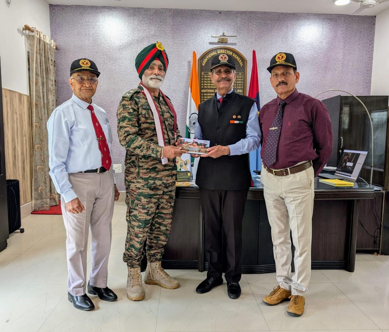 JKESL members comprising of Col Rajinder Singh, Gen Secretary & Lt Col OS Chouhan, Secretary JKESL under the leadership of Lt Gen Rakesh Kumar Sharma, AVSM, SM (Retd) President, J&K Ex-services league called on Maj Gen Anupinder Bevli, ADG NCC Directorate Jammu, Kashmir and Ladakh on 03 Apr at the office premises in Jammu.