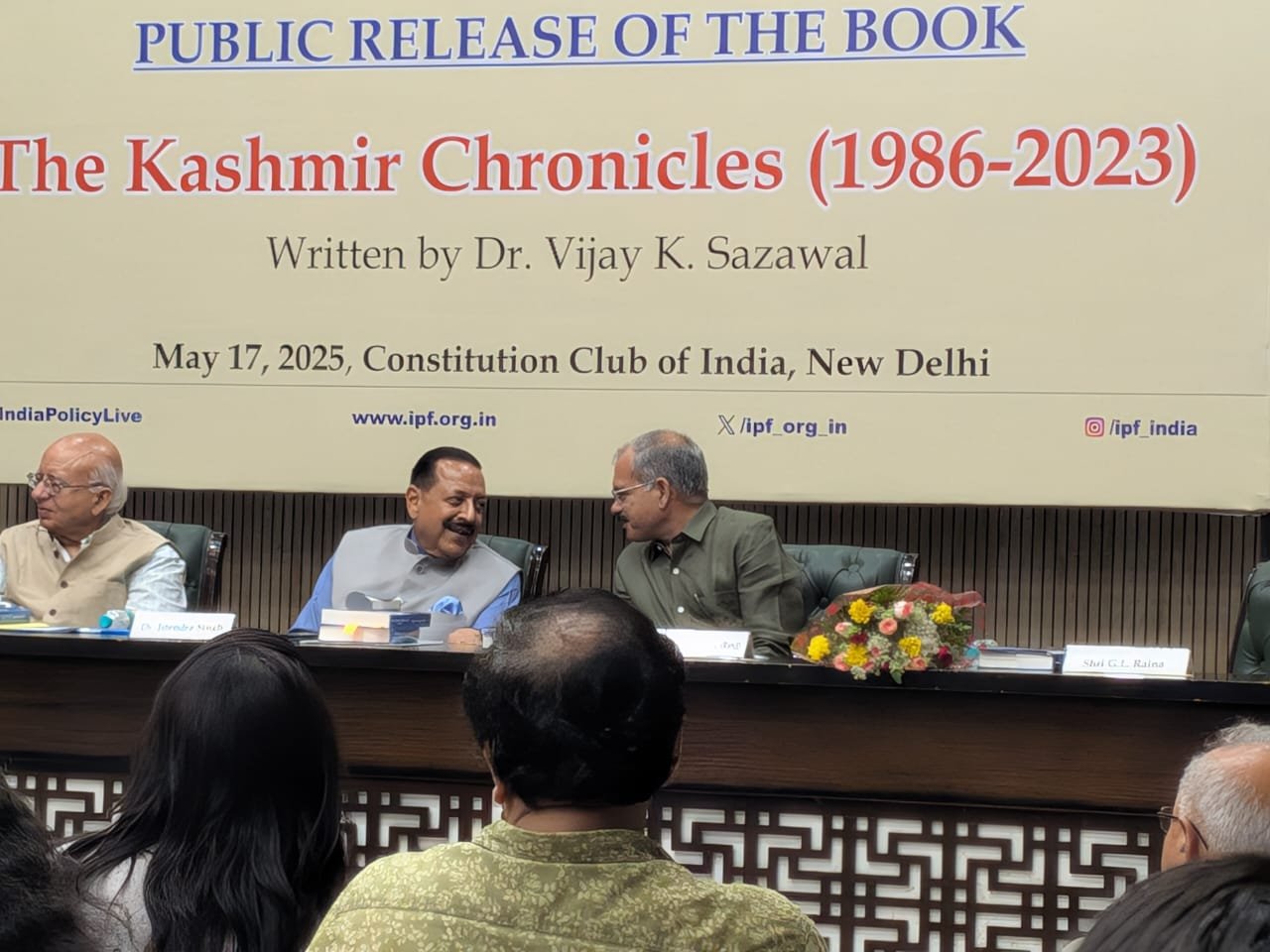 New Delhi,(DD):An event was organised by the India Policy Foundation at the Constitutional Club of India for the release of the book “Kashmir Chronicles (1986–2023): Neoteric Analysis of Rapidly Changing Landscape” .The event was presided over by Dr. Jitendra Singh, Union Minister for Science and Technology, with Brigadier Brijesh Pandey (Retd) as the distinguished guest and keynote speaker.