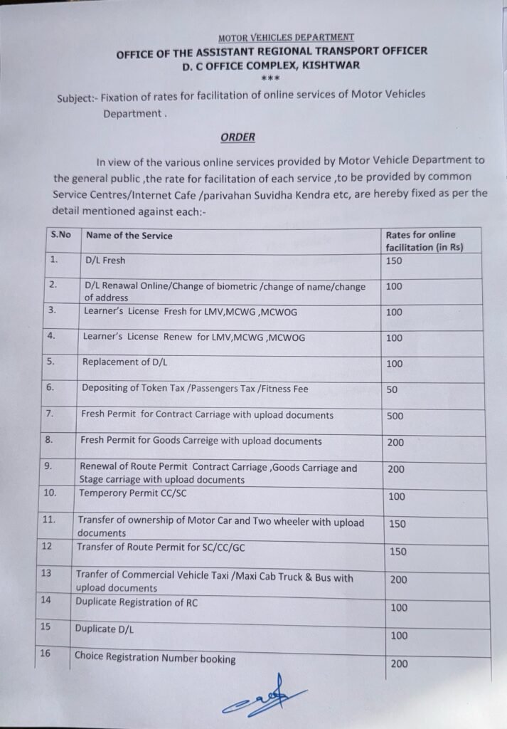 Kishtwar, DD: In a groundbreaking move, the Assistant Regional Transport Officer (ARTO) Tasleem wani Kishtwar, who also serves as the Member Secretary of the Regional Transport Authority, has notified standard rates for the facilitation of online services related to the Motor Vehicles Department.This step has been taken with the approval of Deputy Commissioner Kishtwar, making the district possibly the first in the region to implement such a system.