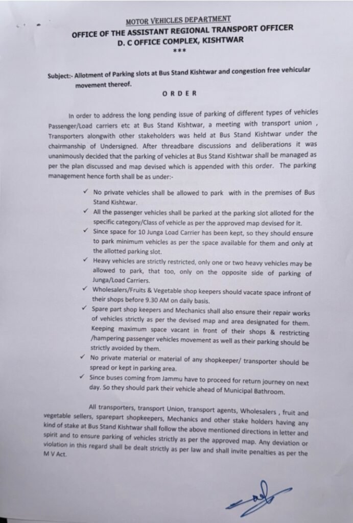 Kishtwar,DD, In an effort to alleviate traffic congestion and improve the flow of vehicles at the busy Bus Stand Kishtwar, the Office of the Assistant Regional Transport Officer (ARTO) Kishtwar Tasleem wani has introduced stringent parking regulations. The new order, effective for 15 days, has been implemented following consultations with local transport unions, shopkeepers, and other stakeholders.