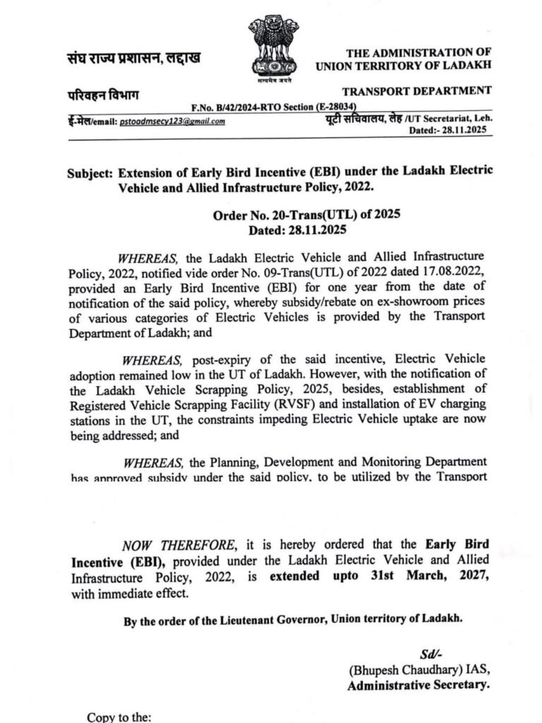 Leh: DD, The Transport Department, Administration of the Union Territory of Ladakh has announced the extension of the Early Bird Incentive (EBI) under the Ladakh Electric Vehicle and Allied Infrastructure Policy, 2022, up to 31st March 2027, with immediate effect.