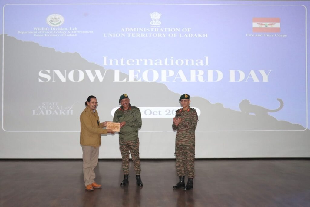 Leh: DD, Committed to raising the awareness for the safe future of the majestic Snow Leopard found in higher regions of Ladakh, the Fire and Fury Corps of Indian Army in collaboration with Ministry of Environment, Forest and Climate Change (MoEFCC) and Ladakh UT came together on 23 October 2025 for celebrating the International Snow Leopard Day to generate awareness on safety and preservation of the elusive species. As part of the celebrations, Fire and Fury Corps organised an awareness programme at Rinchen Auditorium, Leh which was attended by Lieutenant General Hitesh Bhalla, UYSM, SC, SM, VSM, General Officer Commanding, 14 Corps and Mr S Rajesh, IFS, Chief Wild Life Conservator, UT Ladakh alongwith other Military and Civil dignitaries. The awareness programme was aimed at spreading a strong message for nurturing and preserving the snow leopard habitat.